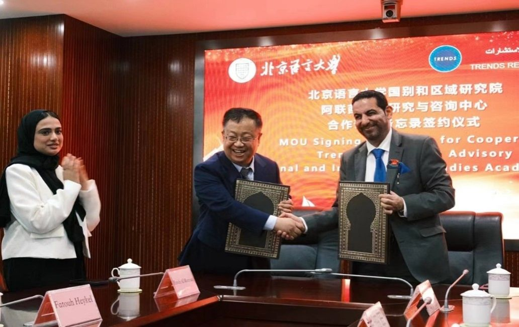 6月22日下午,阿联酋趋势研究与咨询中心(Trends Research & Advisory)代表团一行7人访问北京语言大学。受段鹏校长委托,我校国别和区域研究院院长罗林教授与TRENDS首席执行官穆罕默德·艾勒阿里博士共同签署了谅解与合作备忘录。